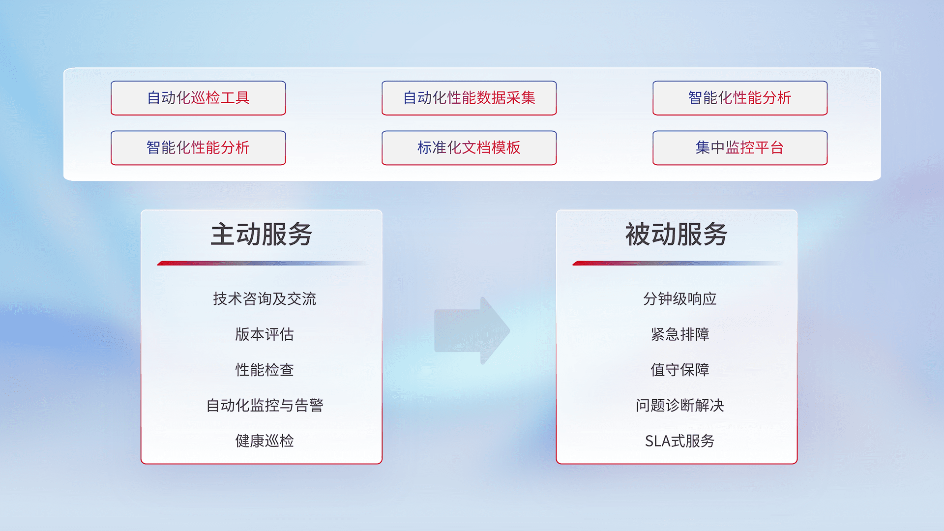 智能化工具和标准化文档,,保障服务质量,,提供主动服务(包含技术咨询、、、版本评估、、性能检查、、、、自动化监控与告警、、、健康巡检)和被动服务包含(分钟级响应、、、紧急排障、、、、值守保障、、、、问题诊断解决、、、SLA服务)。。