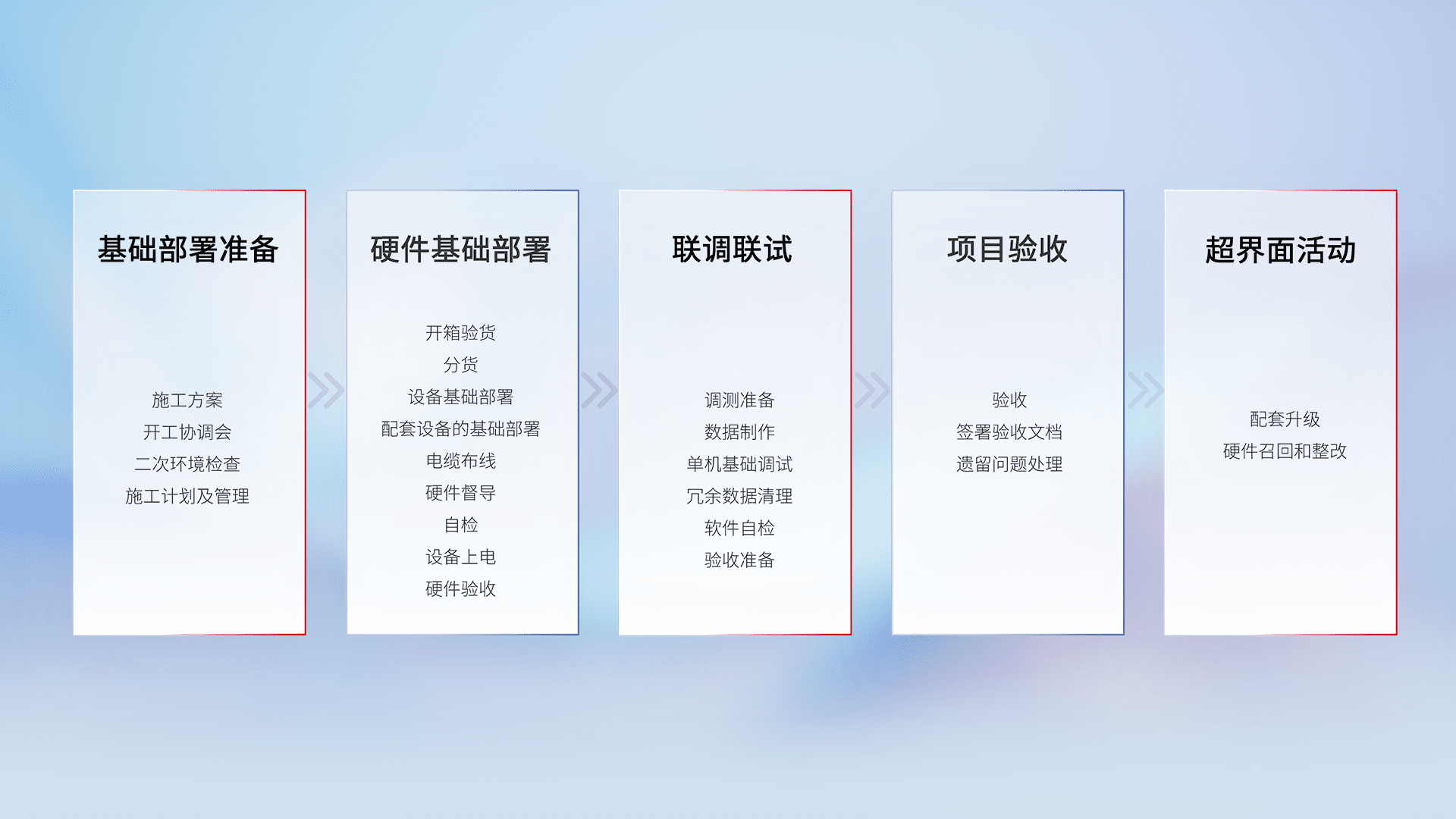 从基础部署准备、、、硬件基础部署、、、、联调联试、、、、项目验收、、、、越界面活动的全过程可追溯,,保证施工质量和进度。。